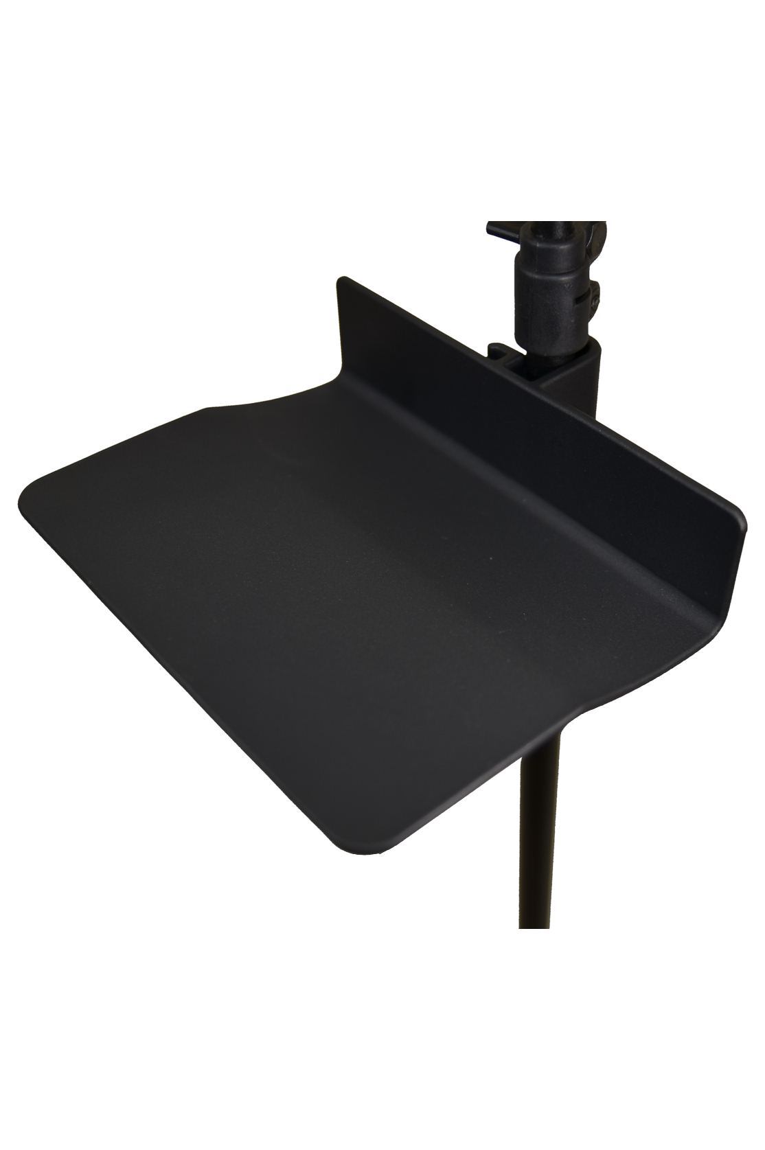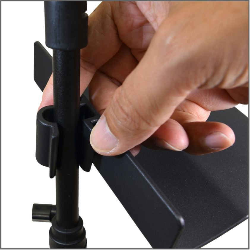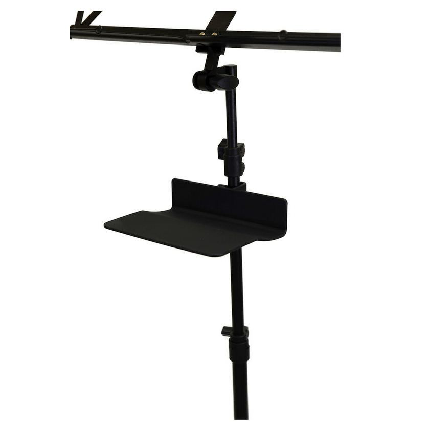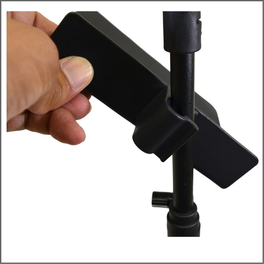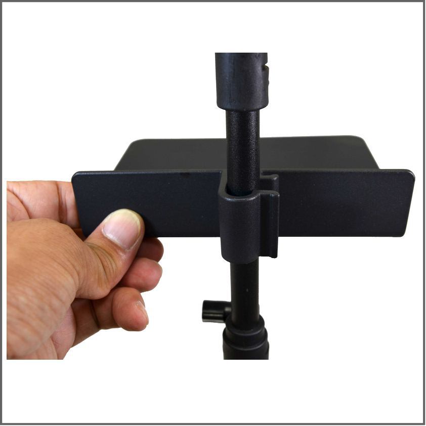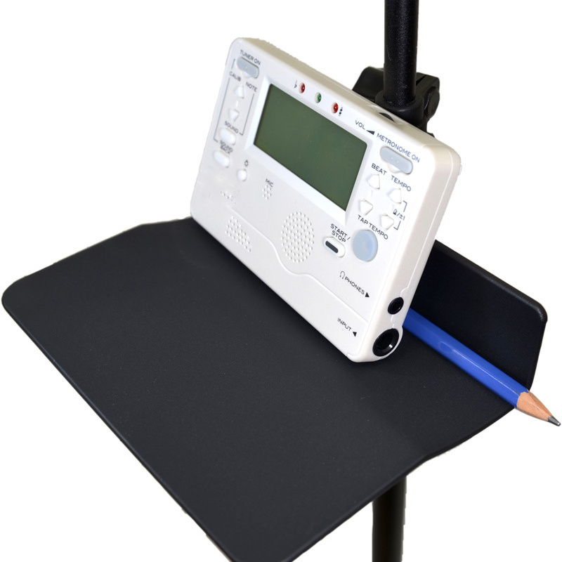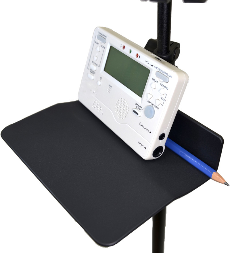 譜めくりの邪魔にならない場所にペンやチューナーを置いておけます。このオリジナル譜面台ラックは、ポールに取り付ける形ですので、ラック自体も譜めくりの邪魔になりません。